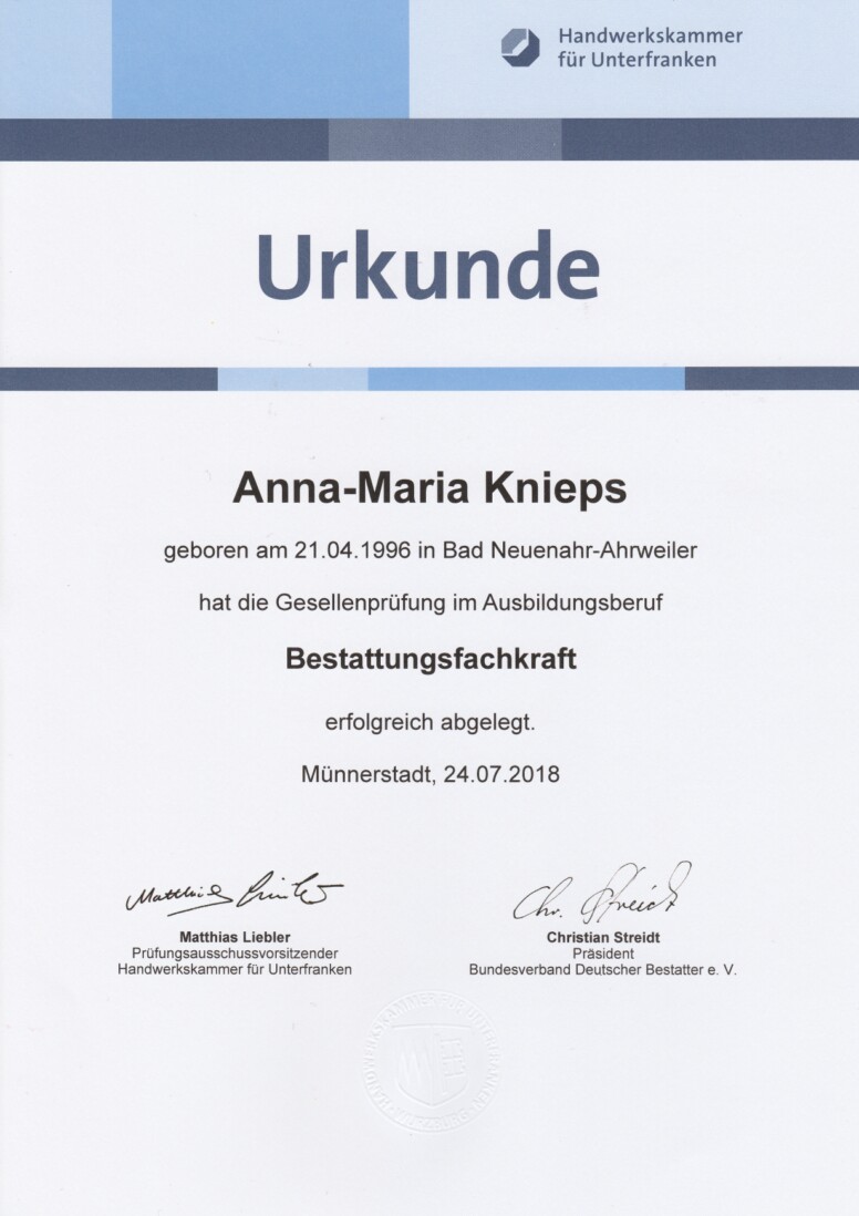 Anna Knieps hat ihre Ausbildung im Jahr 2018 als Bestattungsfachkraft erfolgreich abgeschlossen.